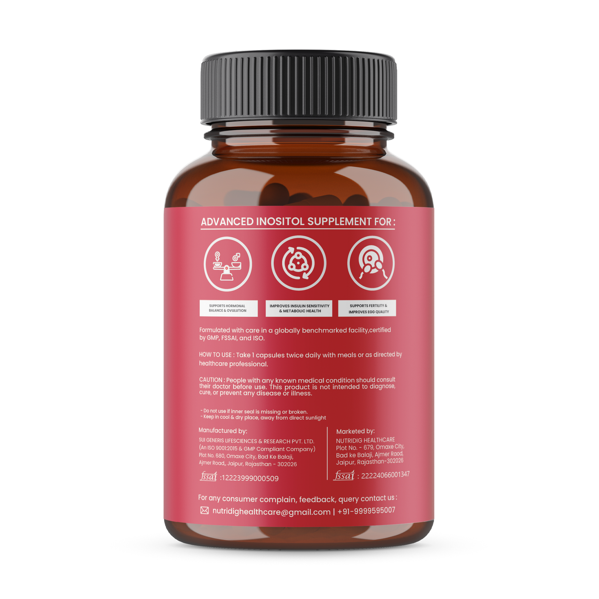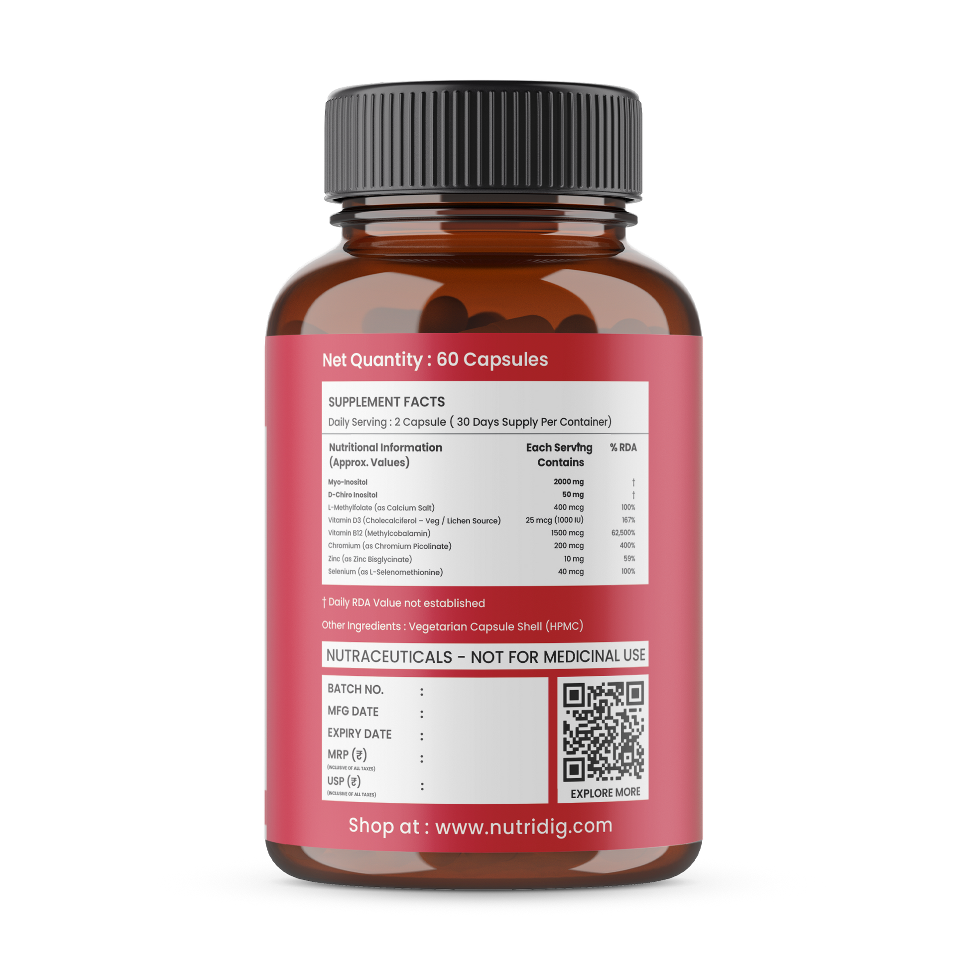Nutridig Myo & D-Chiro Inositol Plus is an advanced, scientifically formulated nutraceutical designed to support women with PCOS and hormonal imbalance. It delivers the clinically preferred 40:1 ratio of Myo-Inositol to D-Chiro Inositol, which plays a key role in improving insulin sensitivity, supporting ovulation, and maintaining hormonal balance.