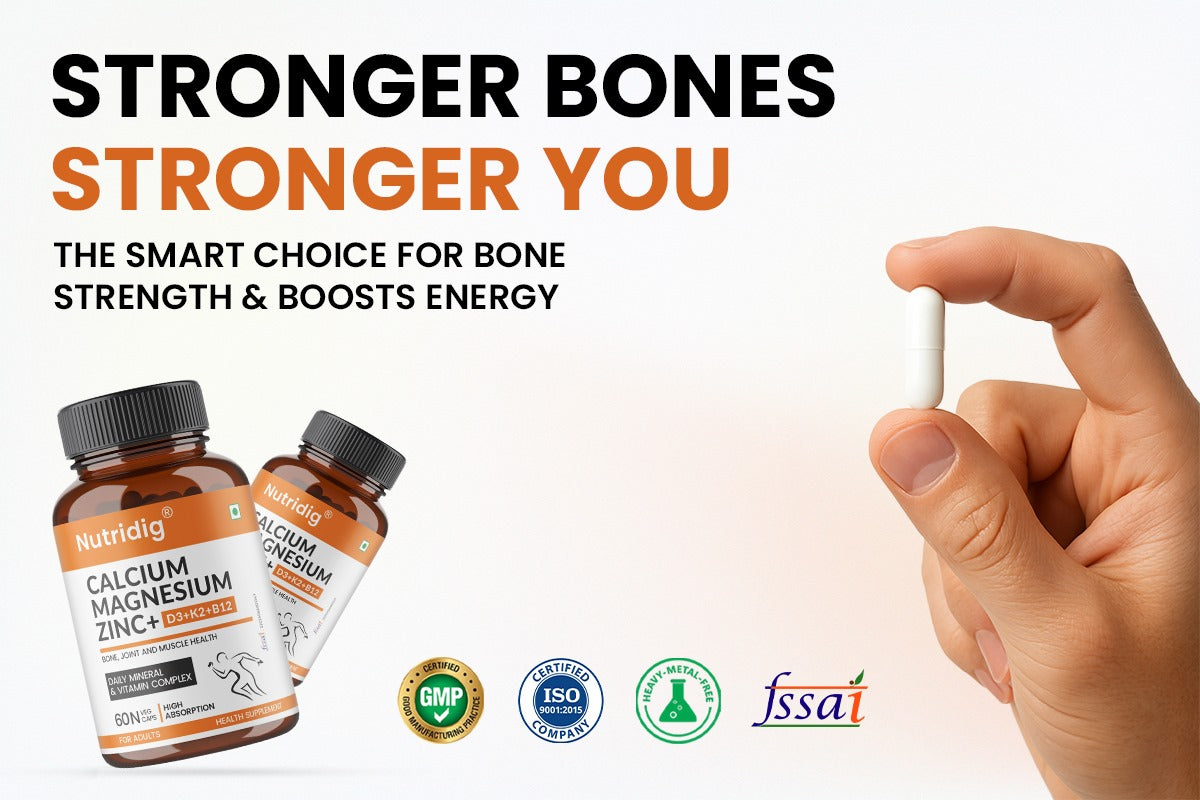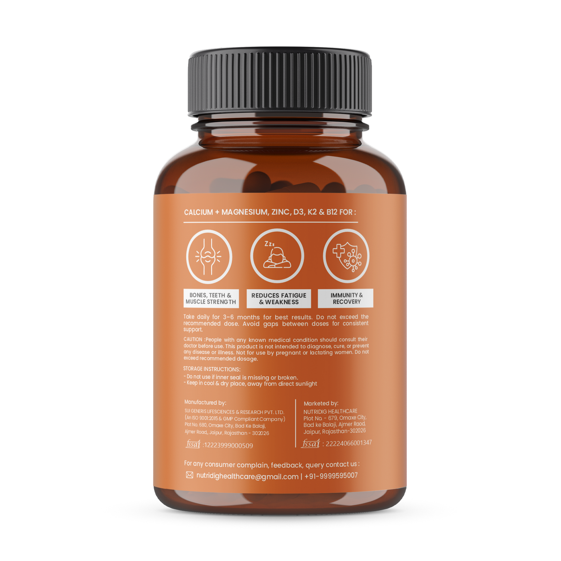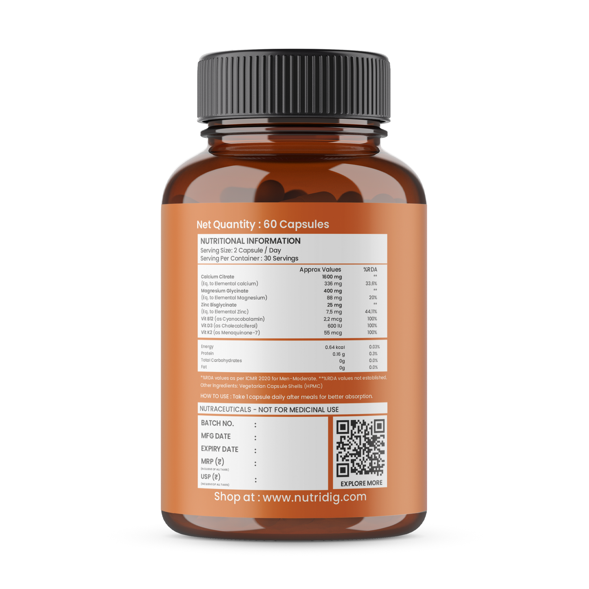 Our premium formulation combines Calcium Citrate, Magnesium Glycinate, and Zinc Bisglycinate – the most bioavailable and gut-friendly forms of these essential minerals. Enriched with Vitamin D3, Vitamin K2, and Vitamin B12, this supplement ensures maximum absorption, better tolerance, and superior results compared to regular forms available in the market.