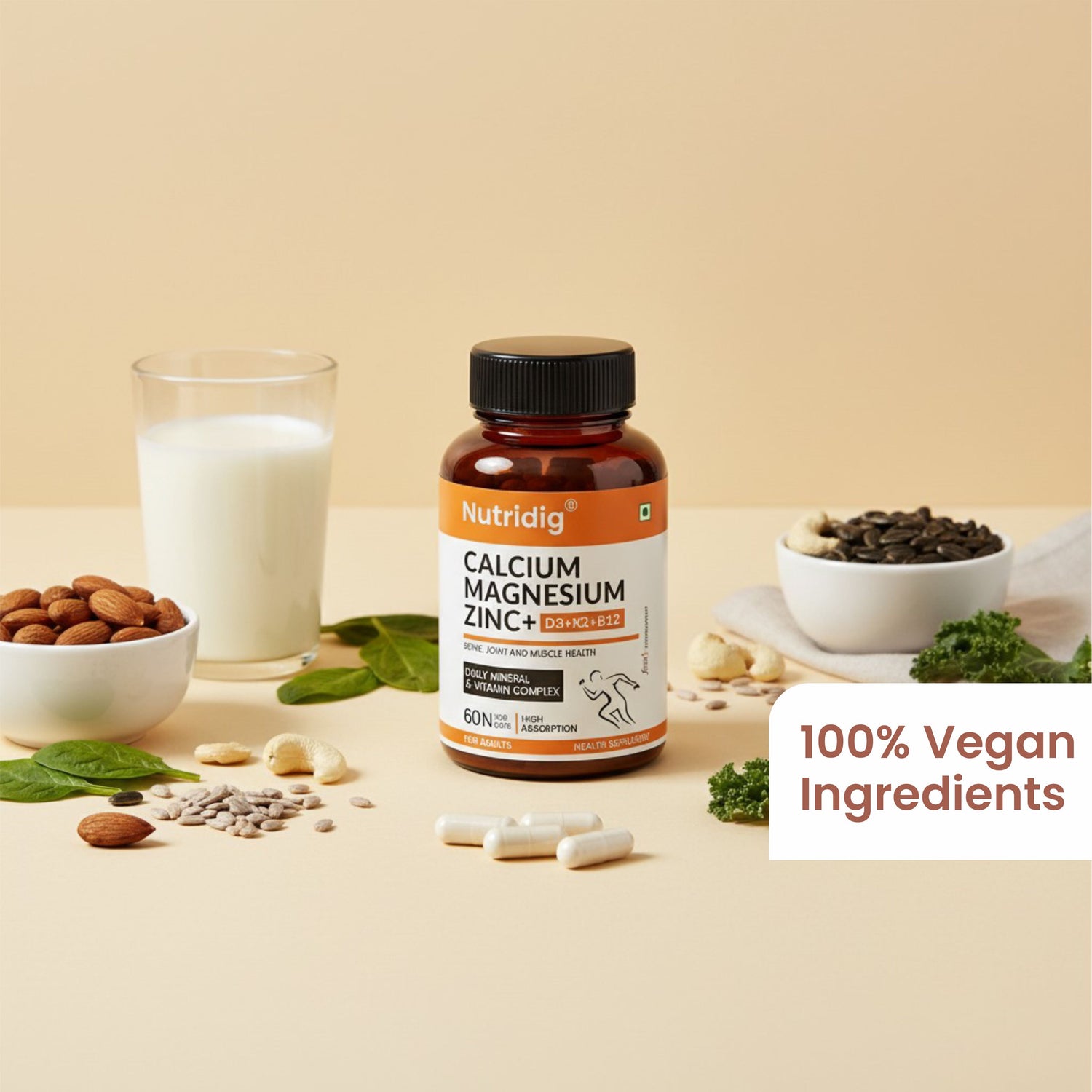 Nutridig® Calcium Magnesium Zinc + Vitamins is completely vegan, free from animal-derived ingredients, and made with clean, high-quality raw materials.