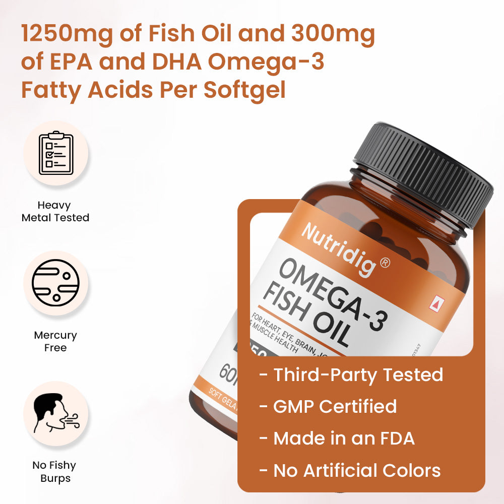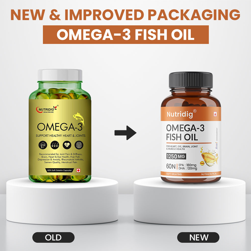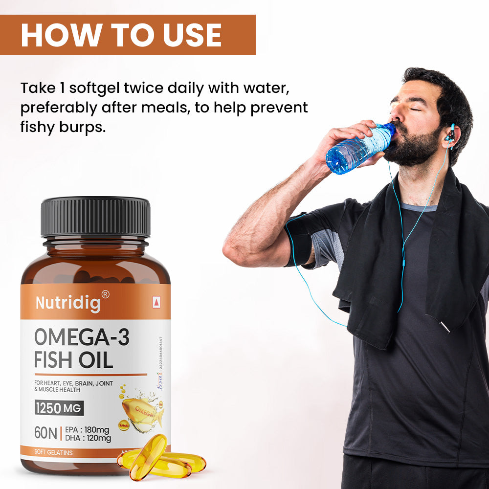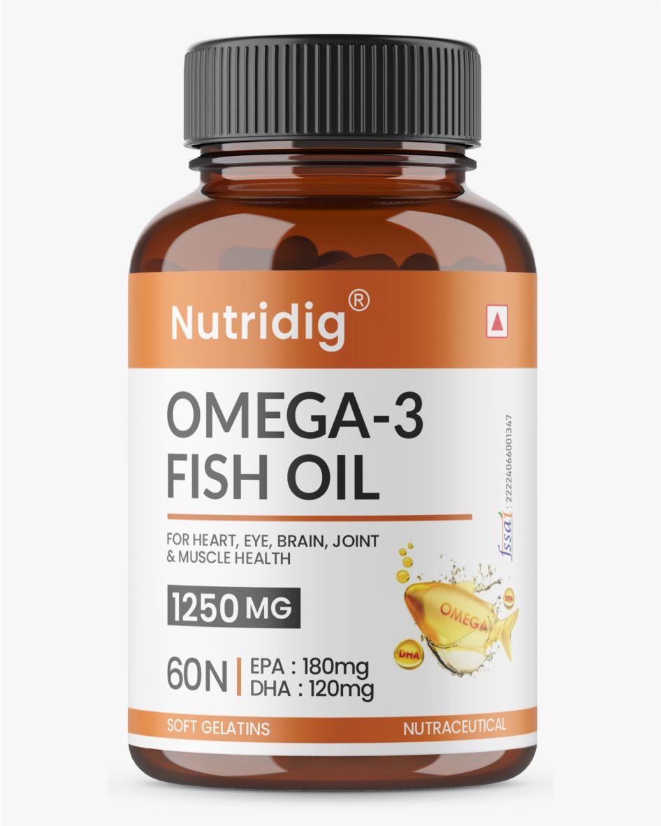 Nutridig’s GOLD Standard Omega-3 Fish Oil softgels delivers 1250 mg of pure fish oil, providing 180 mg EPA and 120 mg DHA for optimal daily wellness.