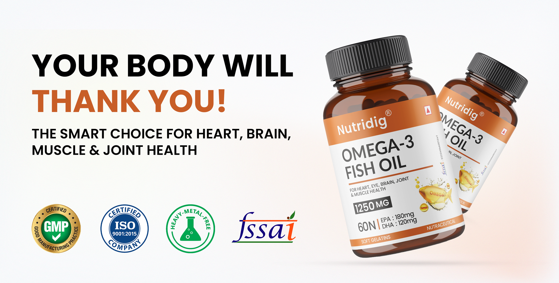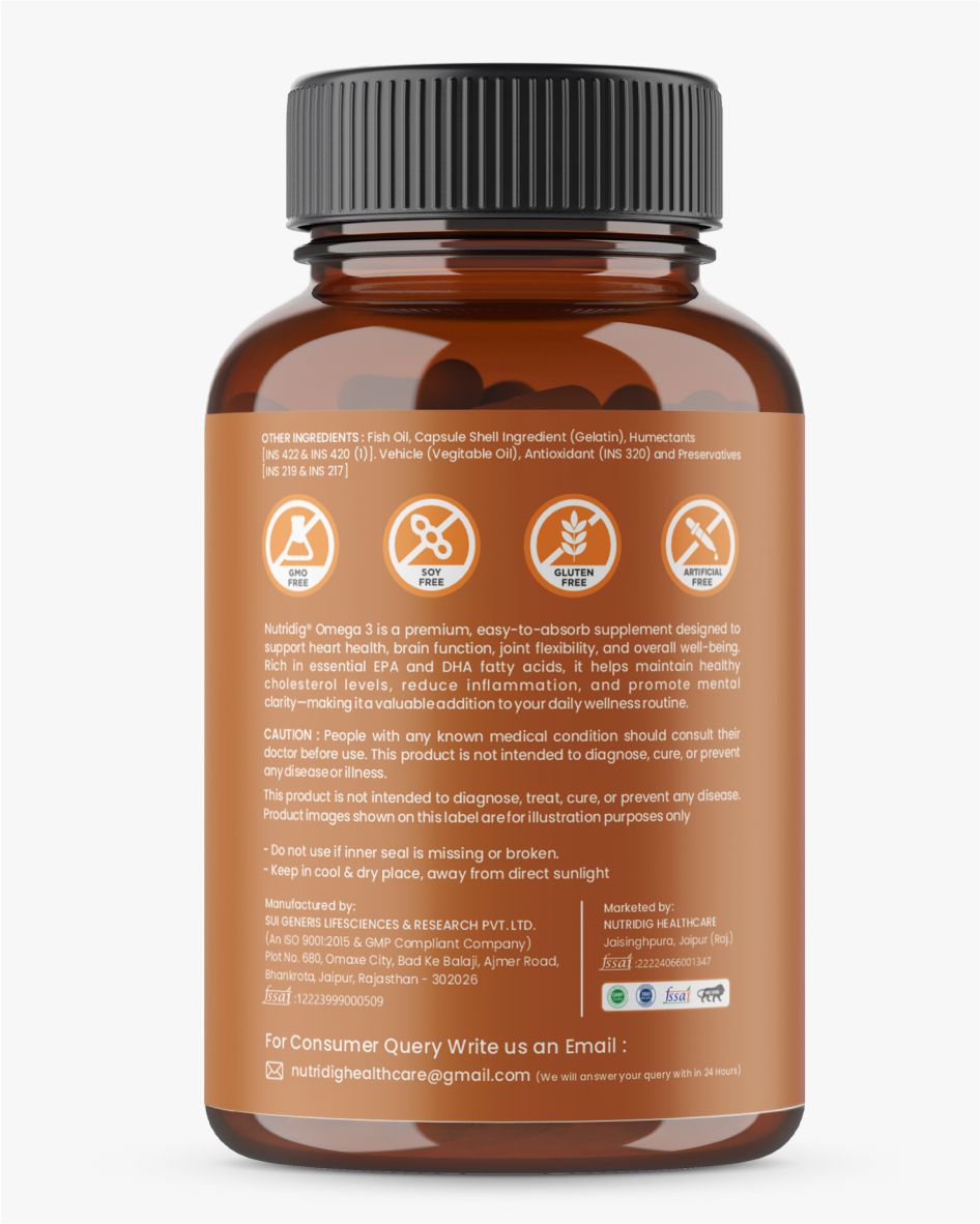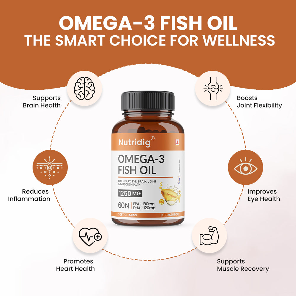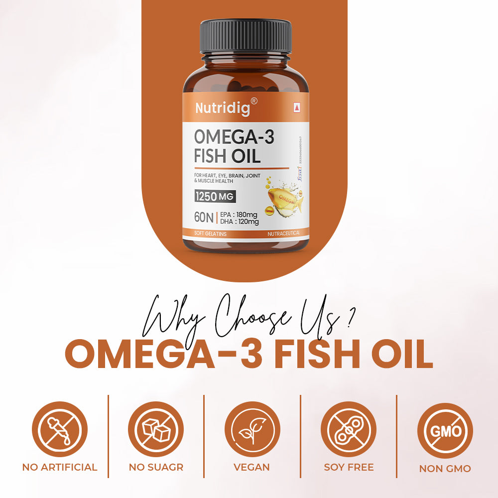Nutridig’s GOLD Standard Omega-3 Fish Oil softgels delivers 1250 mg of pure fish oil, providing 180 mg EPA and 120 mg DHA for optimal daily wellness.