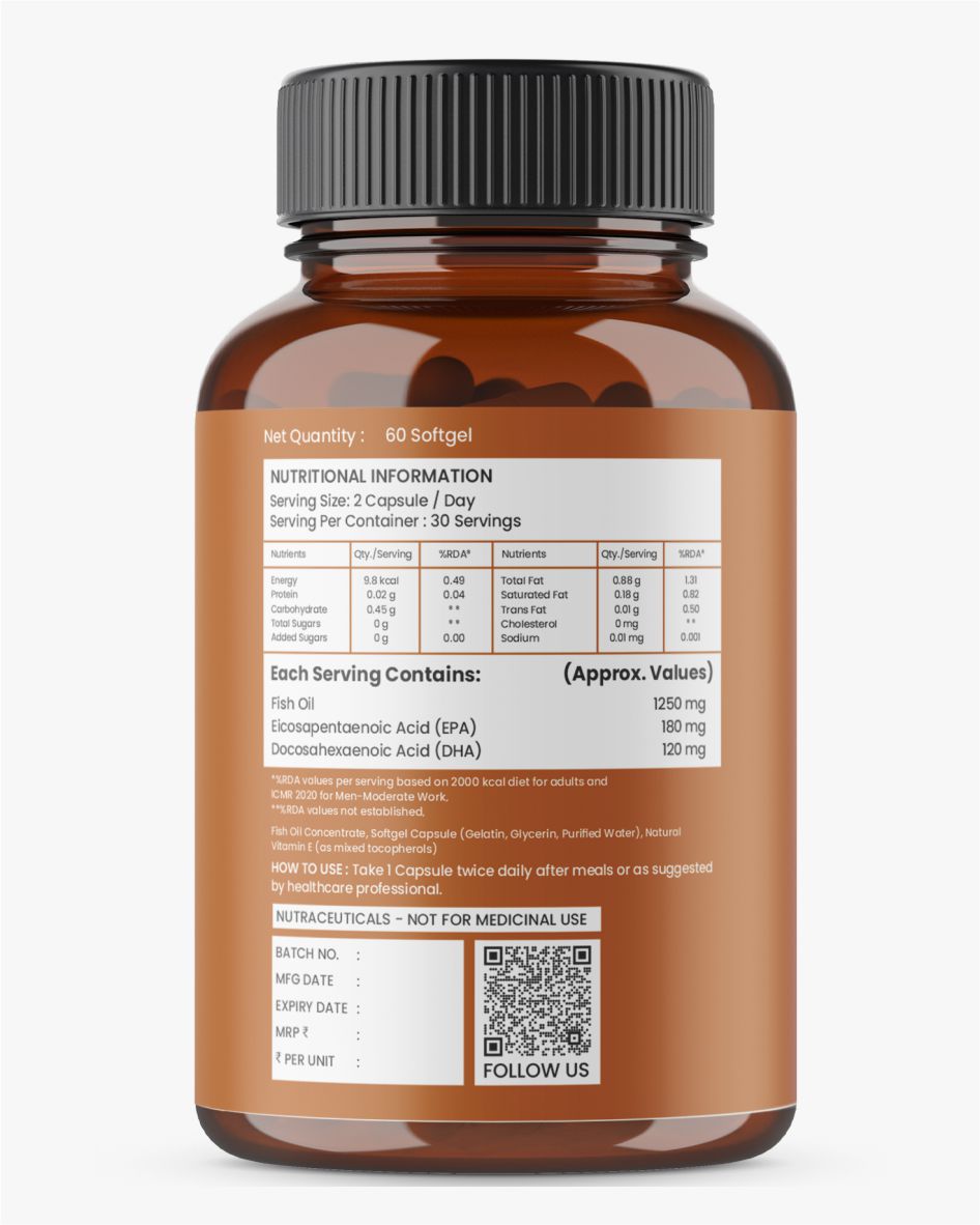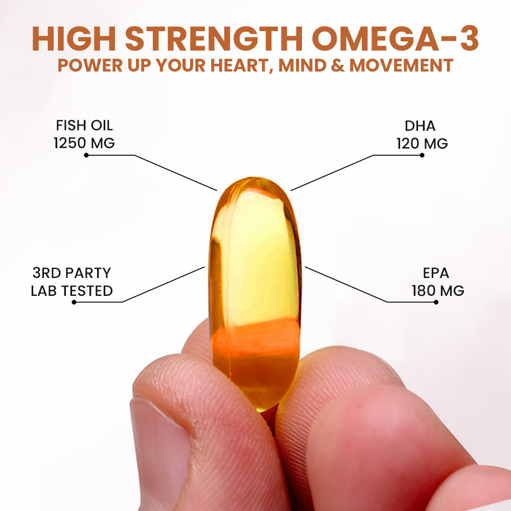 Fish Oil Omega-3 Softgel Capsules 1250mg - High Strength Supplement | 60 Softgels
