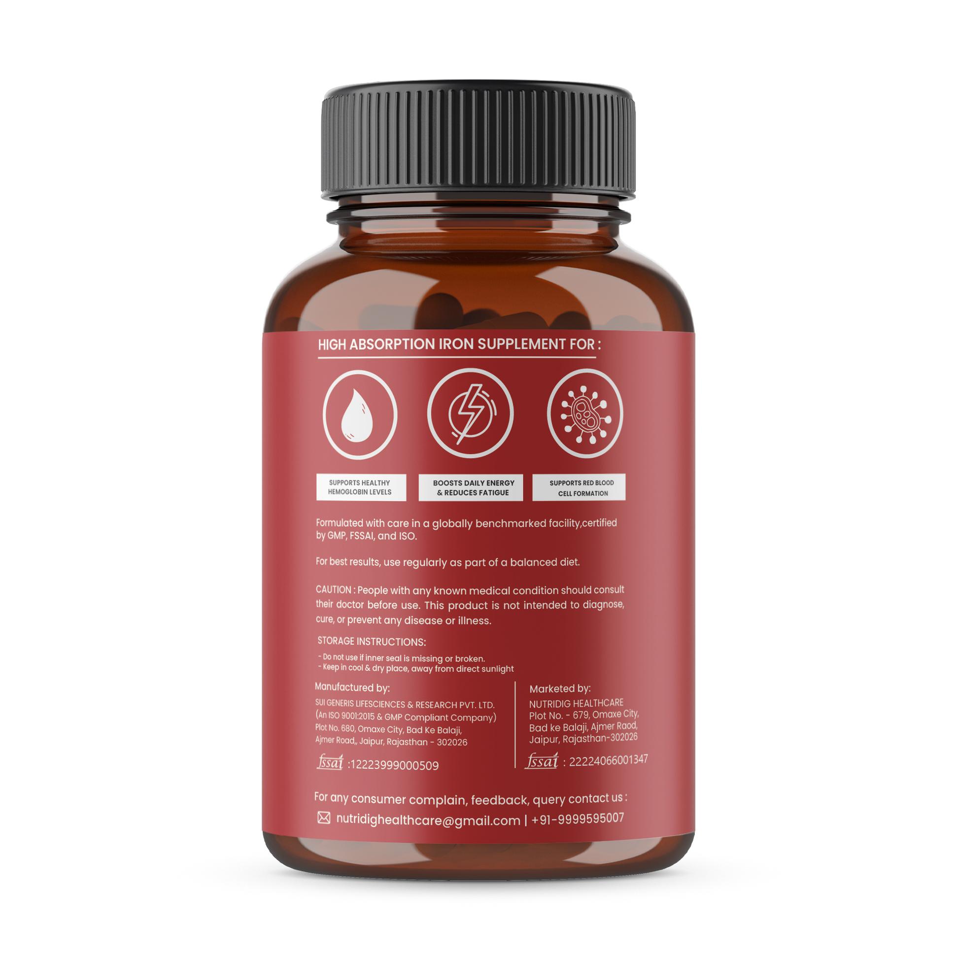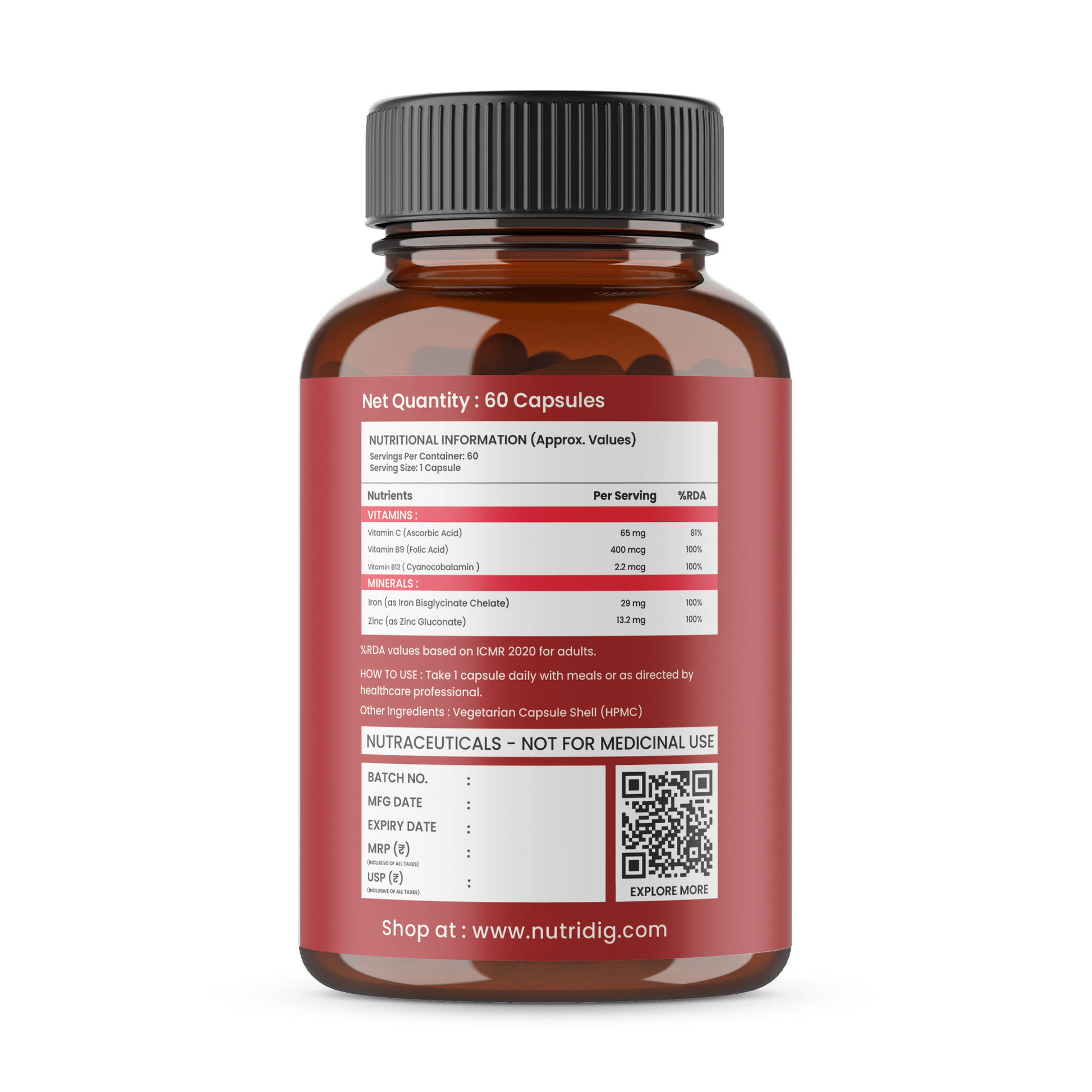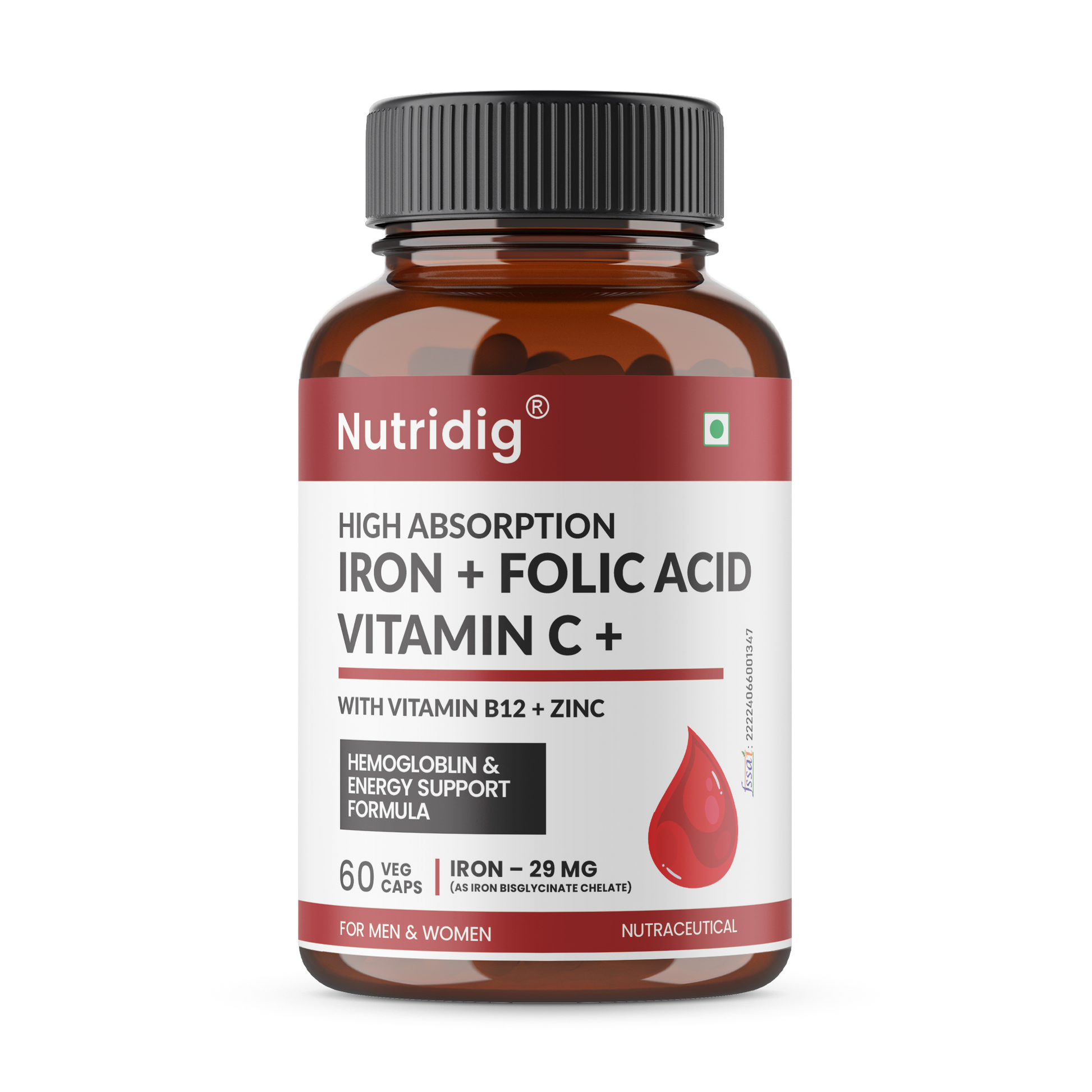 Nutridig High Absorption Iron Plus is an advanced, scientifically formulated nutraceutical designed to support healthy hemoglobin levels, red blood cell production, and overall energy in men and women. It features highly bioavailable Iron Bisglycinate Chelate, combined with Folic Acid, Vitamin C, Vitamin B12, and Zinc to enhance iron absorption and support optimal blood health.