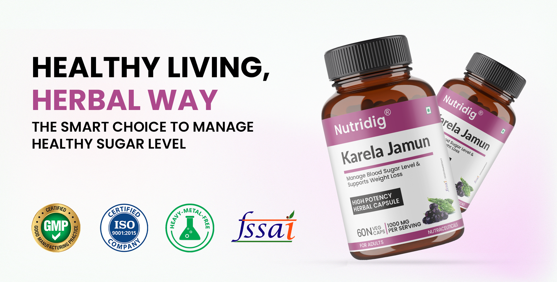 Our Karela Jamun Capsules are enriched with the goodness of Bitter Gourd (Karela), Black Plum (Jamun), Fenugreek (Methi), Neem, and Amla extracts. This traditional herbal blend is designed to support overall wellness, metabolic health, and natural balance in daily life.