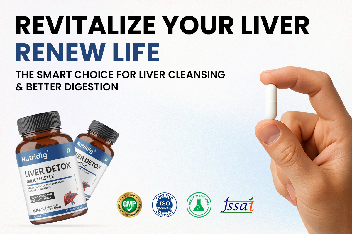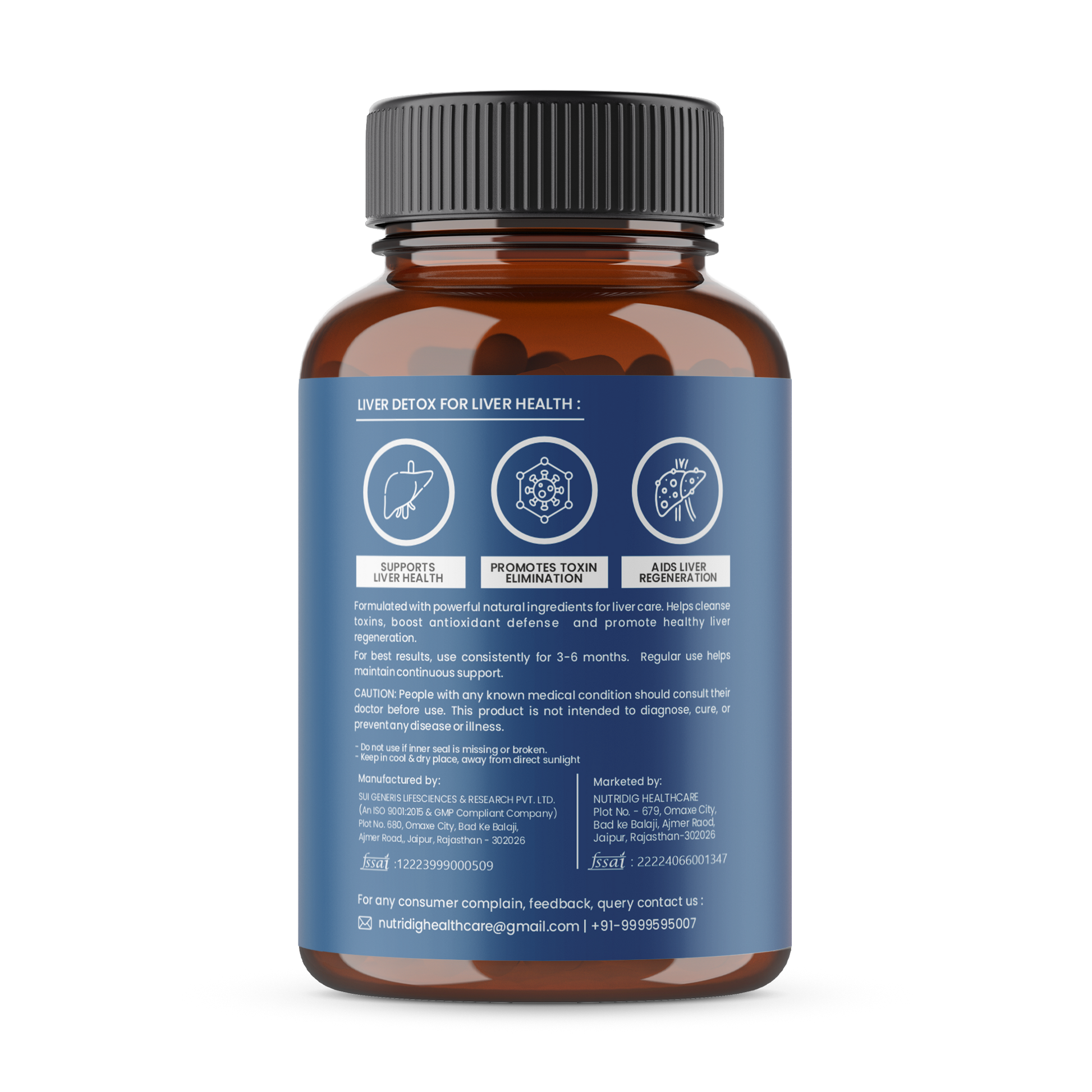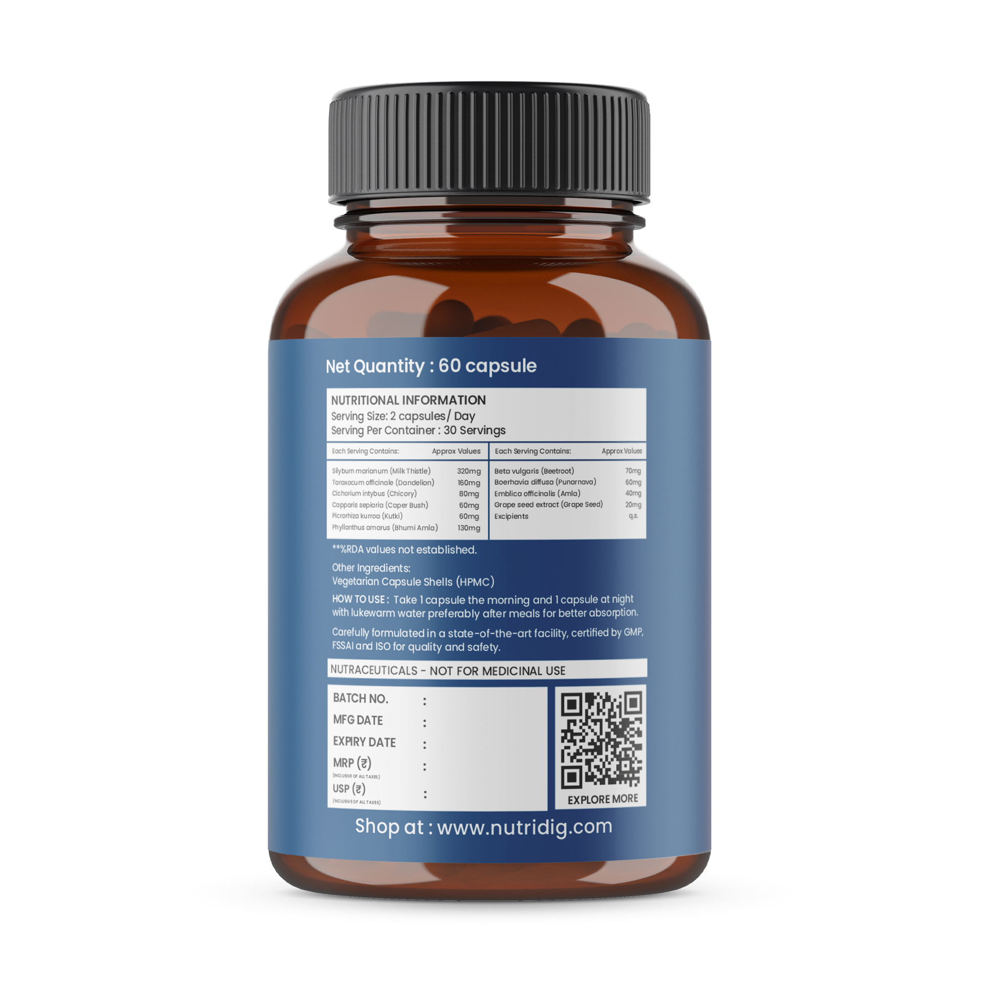Nutridig® Liver Detox & Support is a science-backed blend of high-potency herbal extracts including Milk Thistle, Dandelion Root, Chicory, Himsara, Kutki, Bhumi Amla, Beetroot, Amla, Punarnava, and Grape Seed Extract. Together, these botanicals work synergistically to promote liver cleansing, protect against oxidative stress, and support healthy liver function.