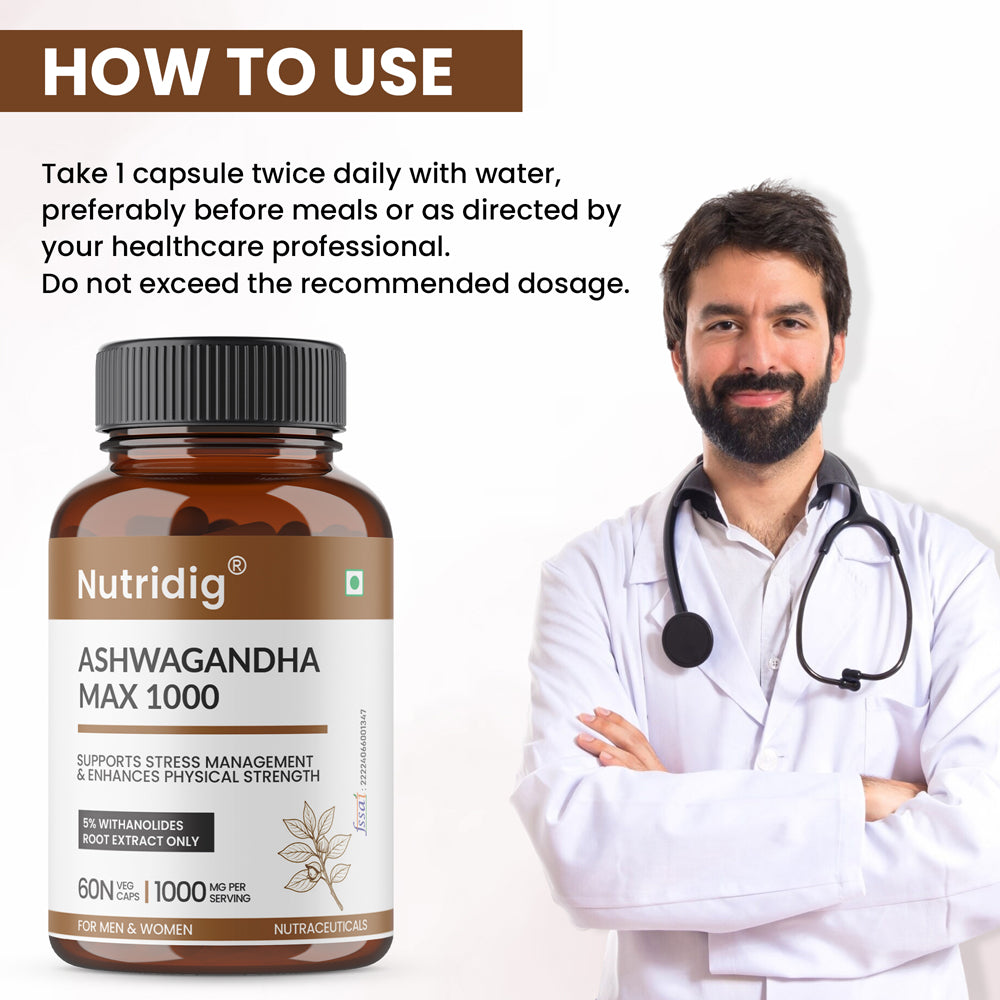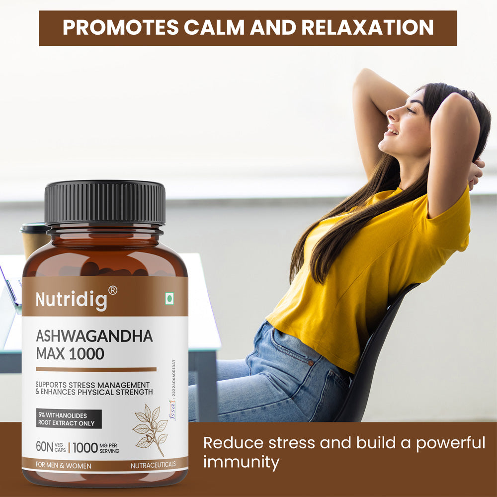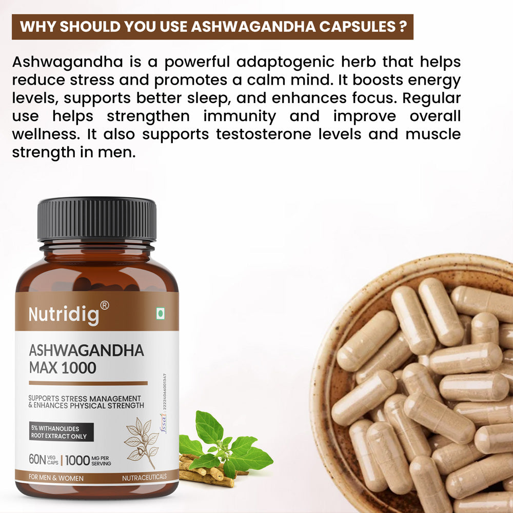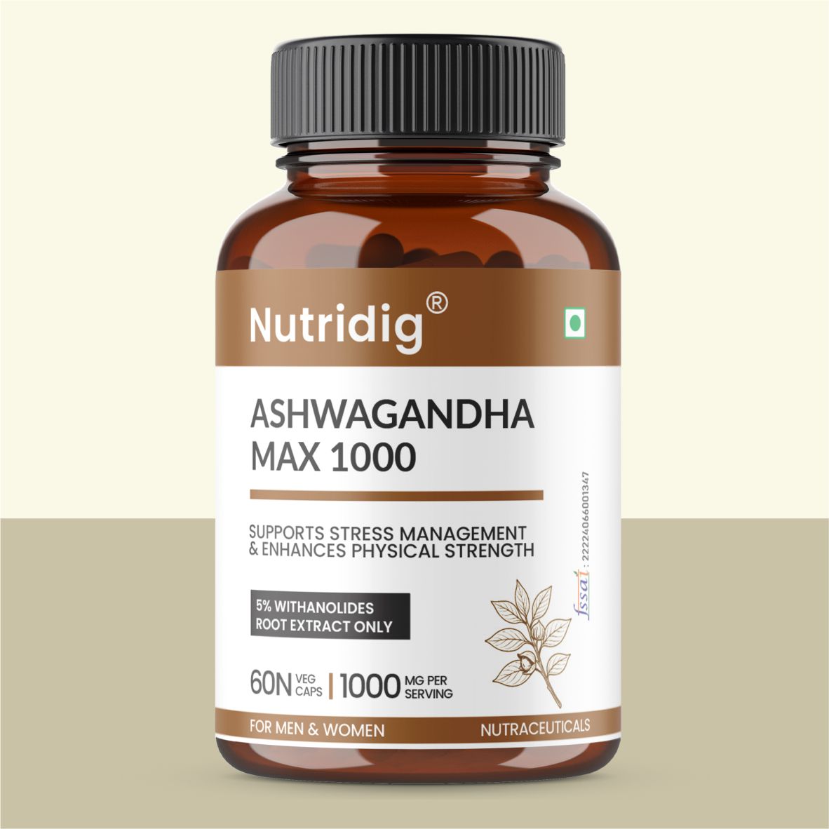 Nutridig® Ashwagandha Max 1000 mg – High Potency 60 Capsules | Stress Relief, Vigor & Immunity Supplement