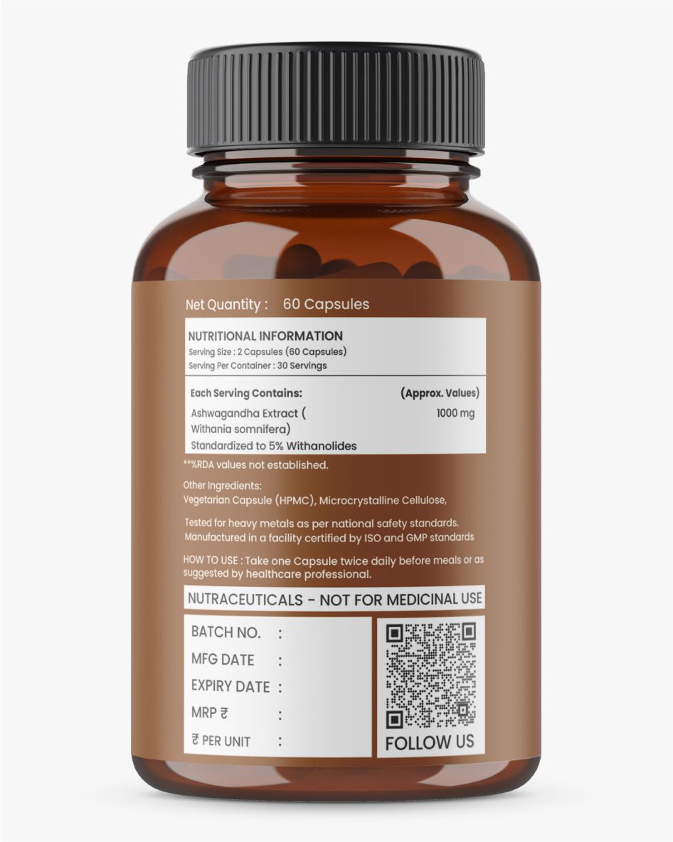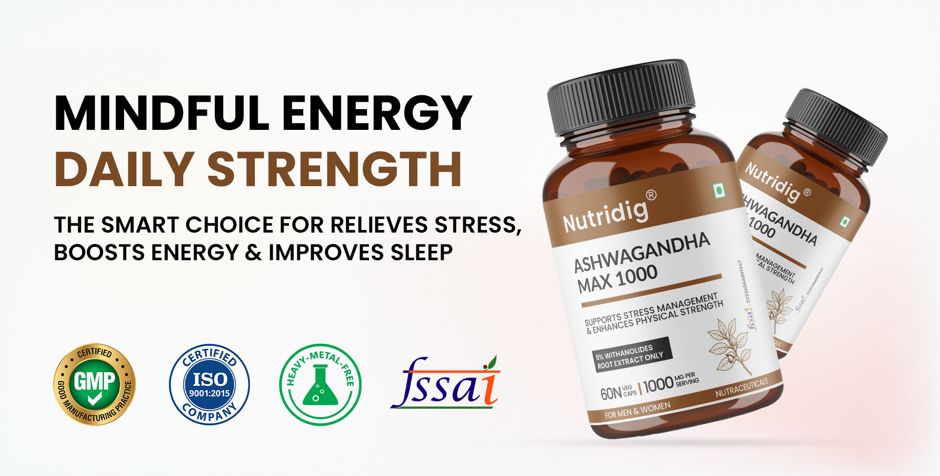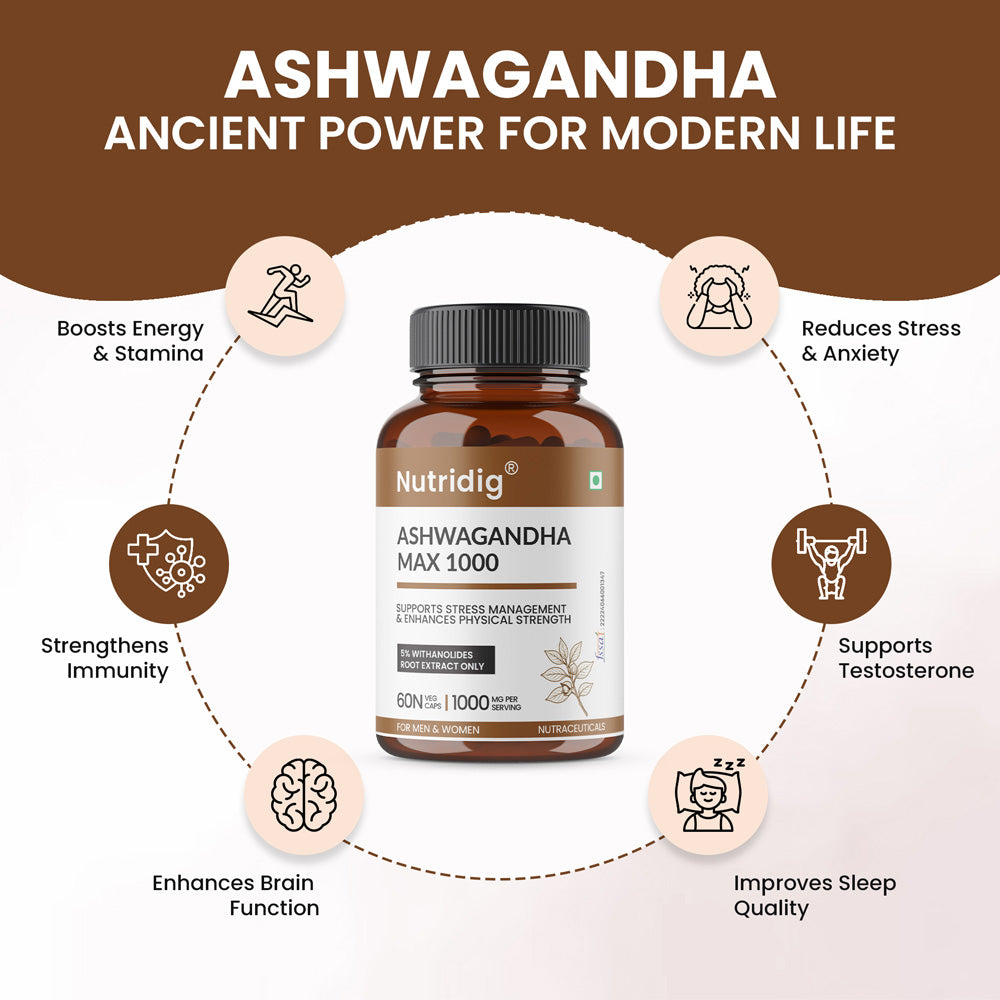 Nutridig® Ashwagandha Max 1000 mg – High Potency 60 Capsules | Stress Relief, Vigor & Immunity Supplement