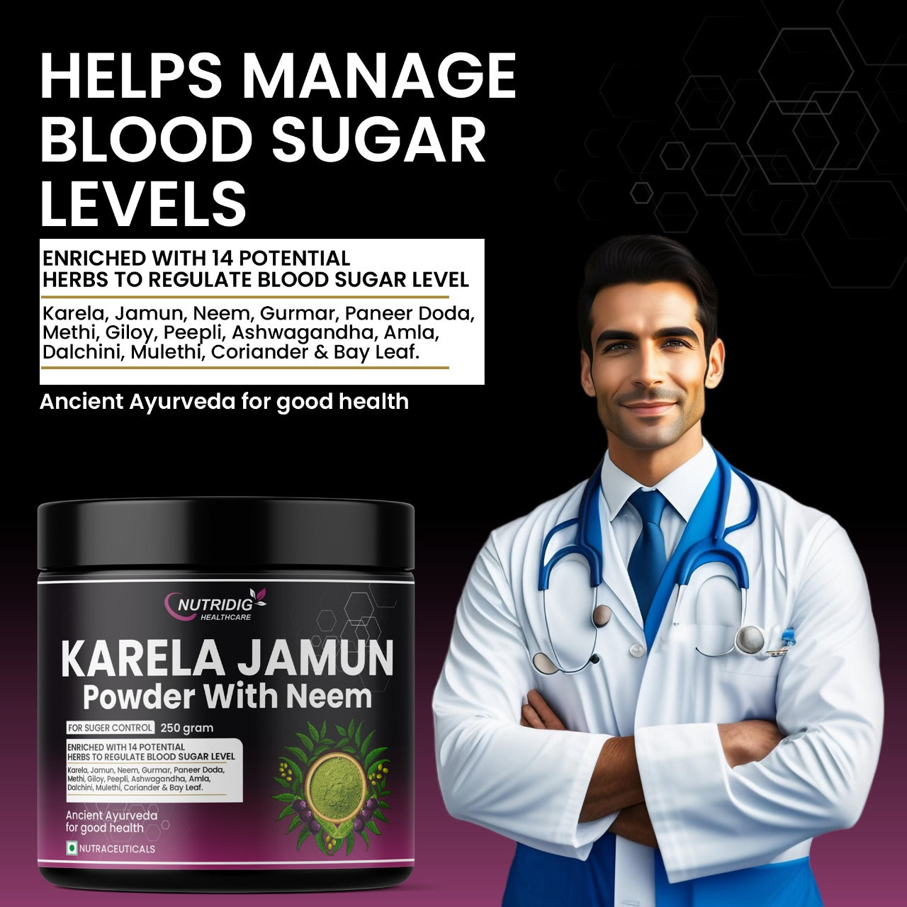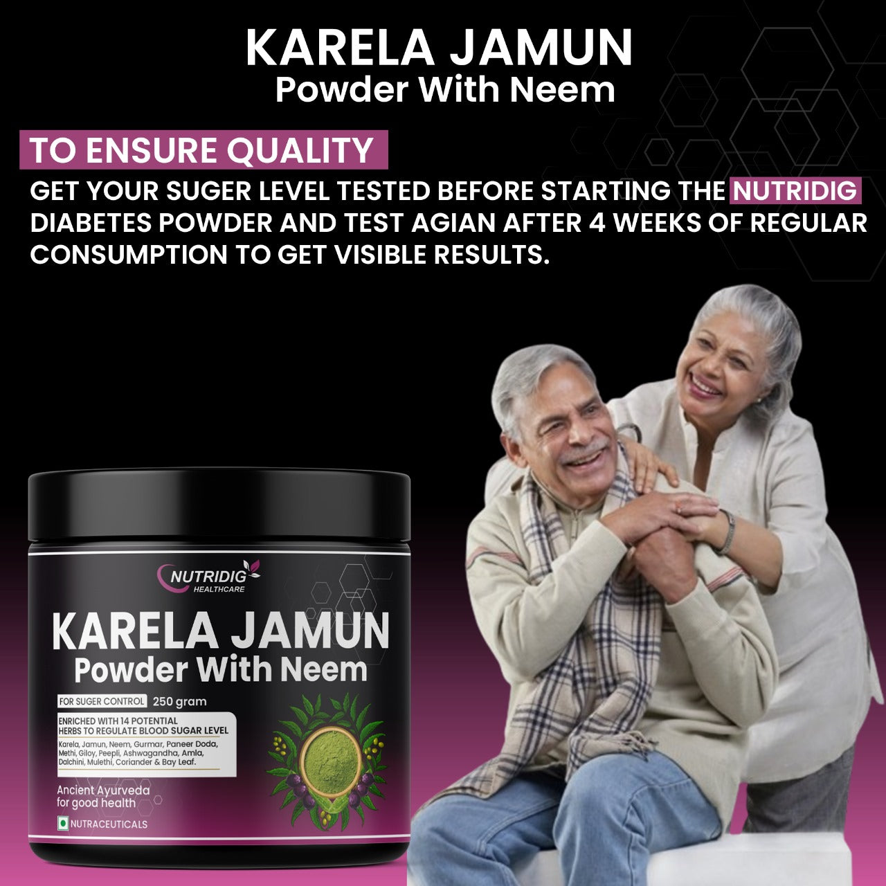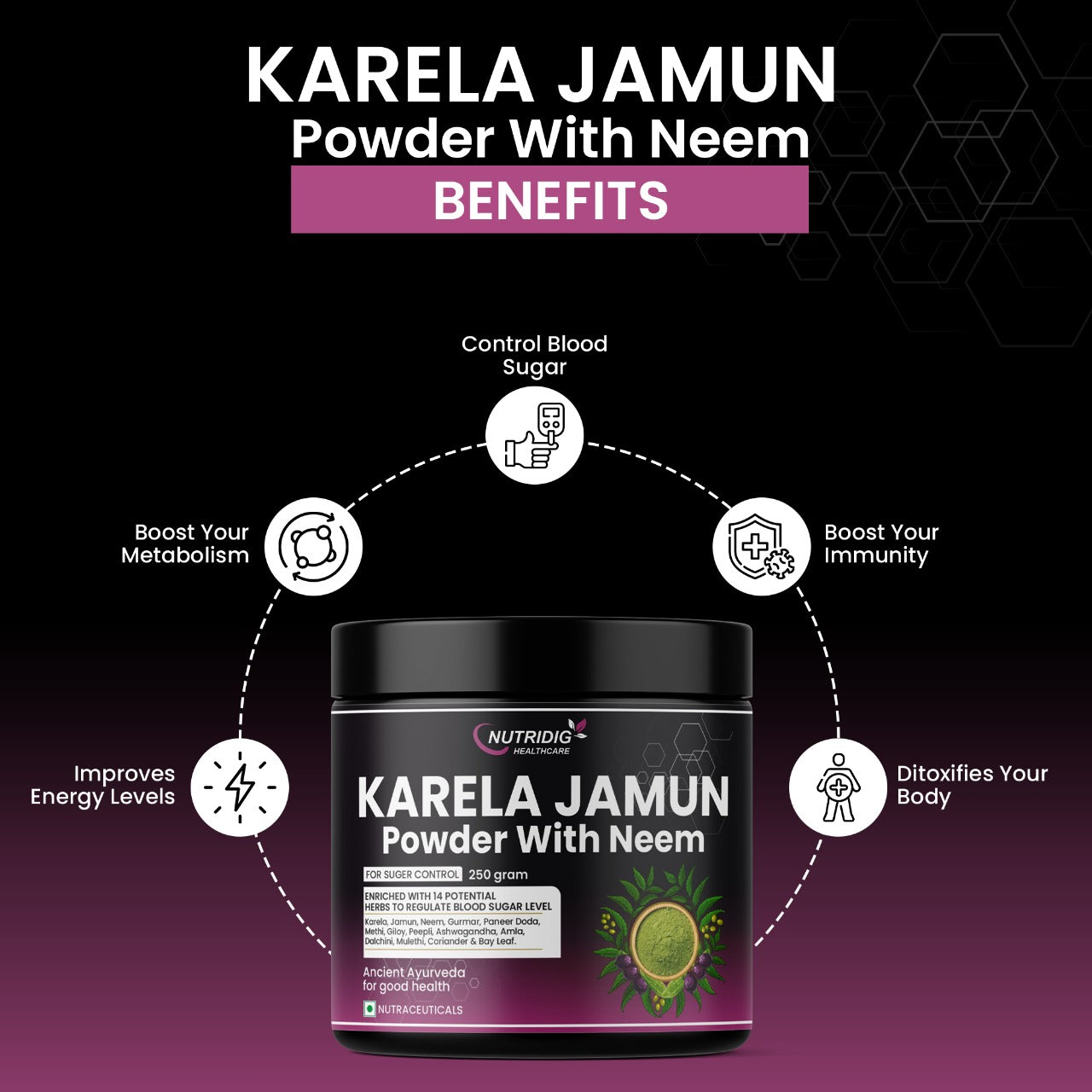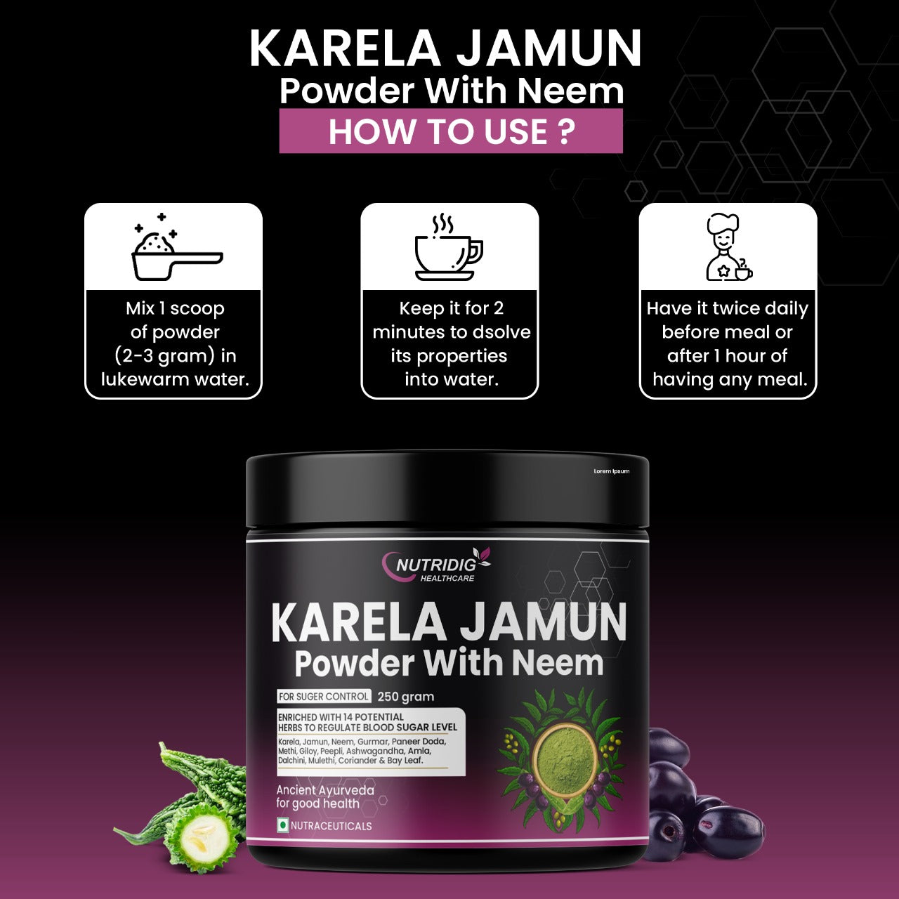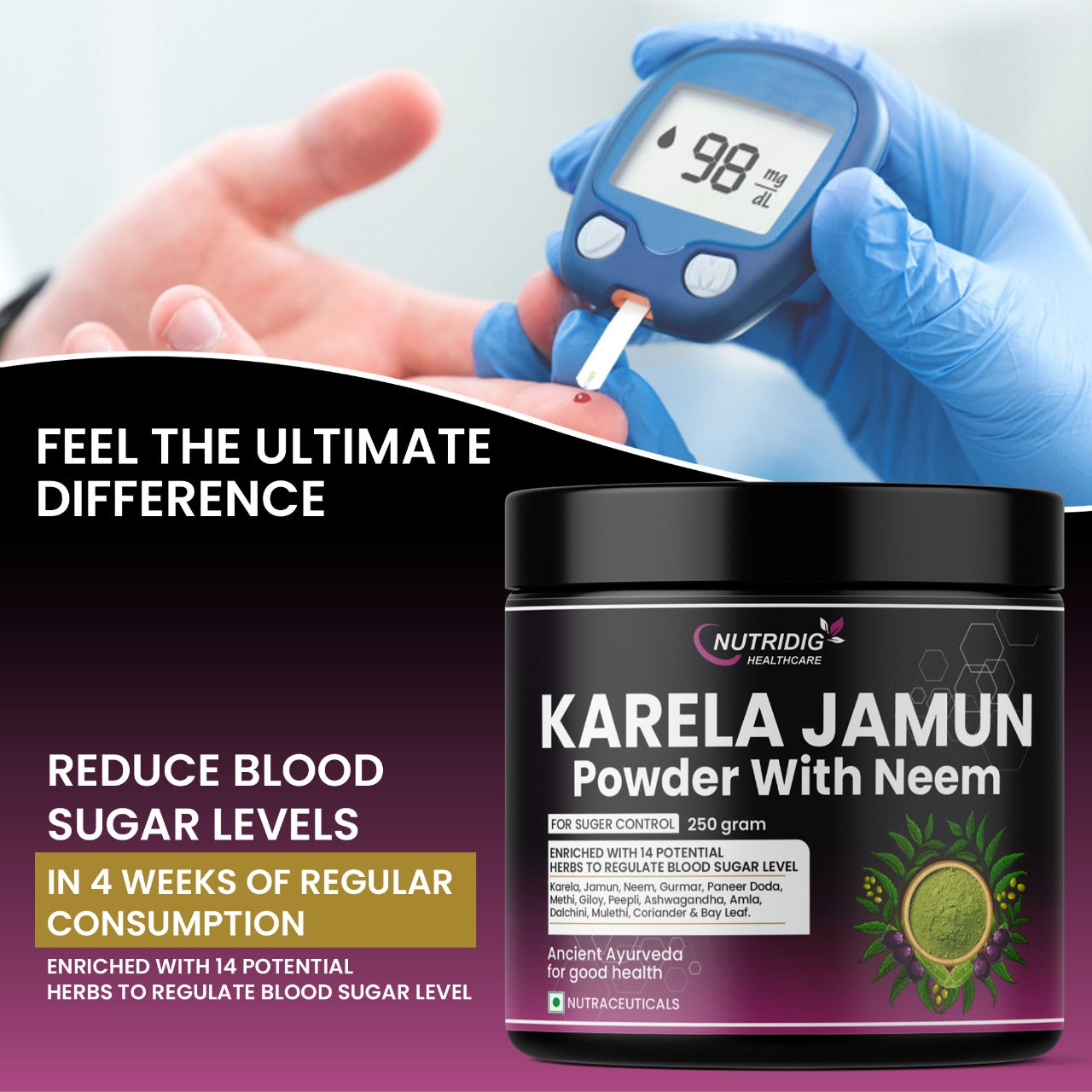 Nutridig Karela Jamun Neem Powder is a carefully crafted herbal blend inspired by traditional practices. This natural formulation combines Karela (Bitter Gourd), Jamun (Indian Blackberry), Neem & other potent herbs, to support metabolic health and blood sugar management.