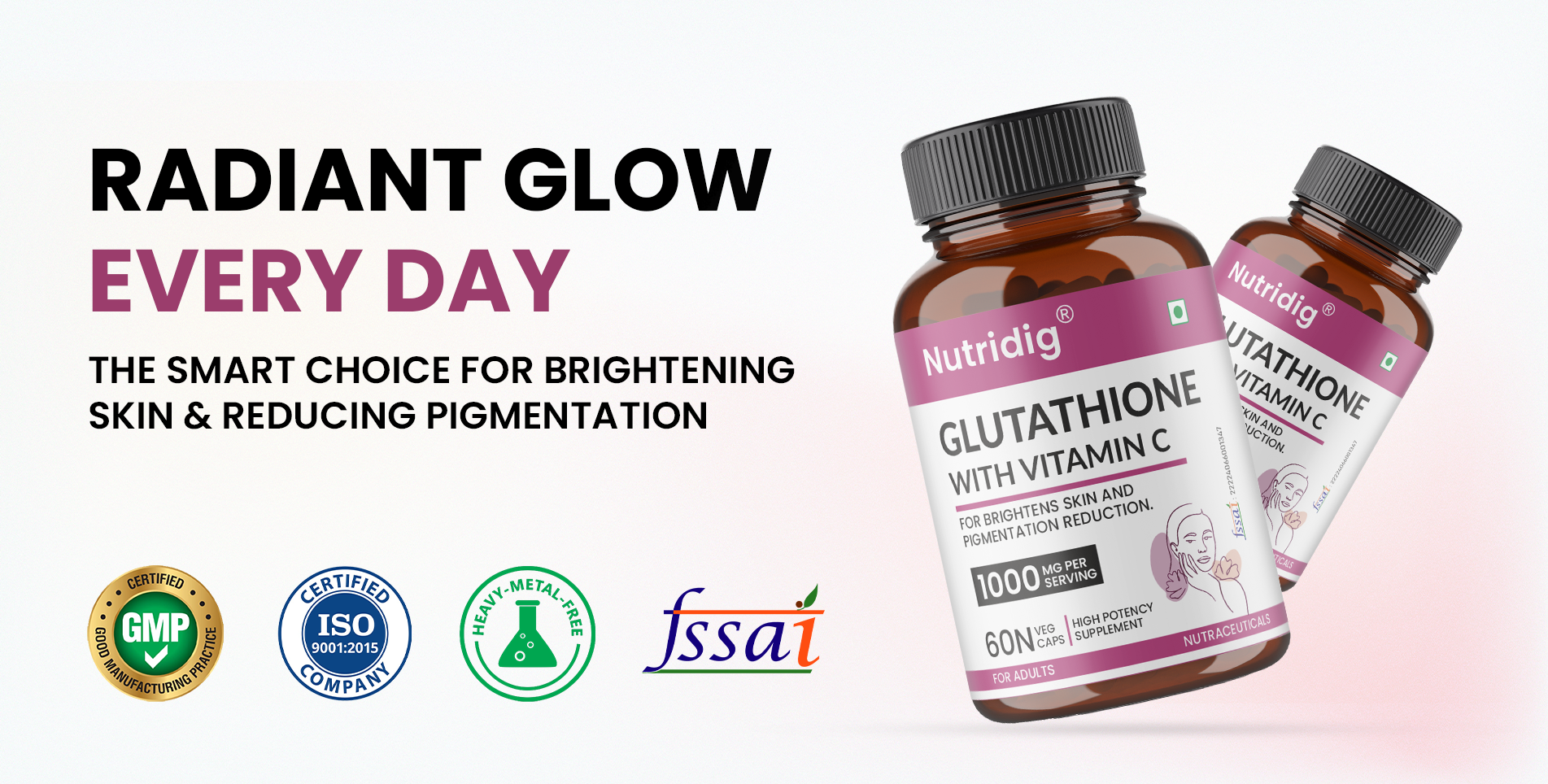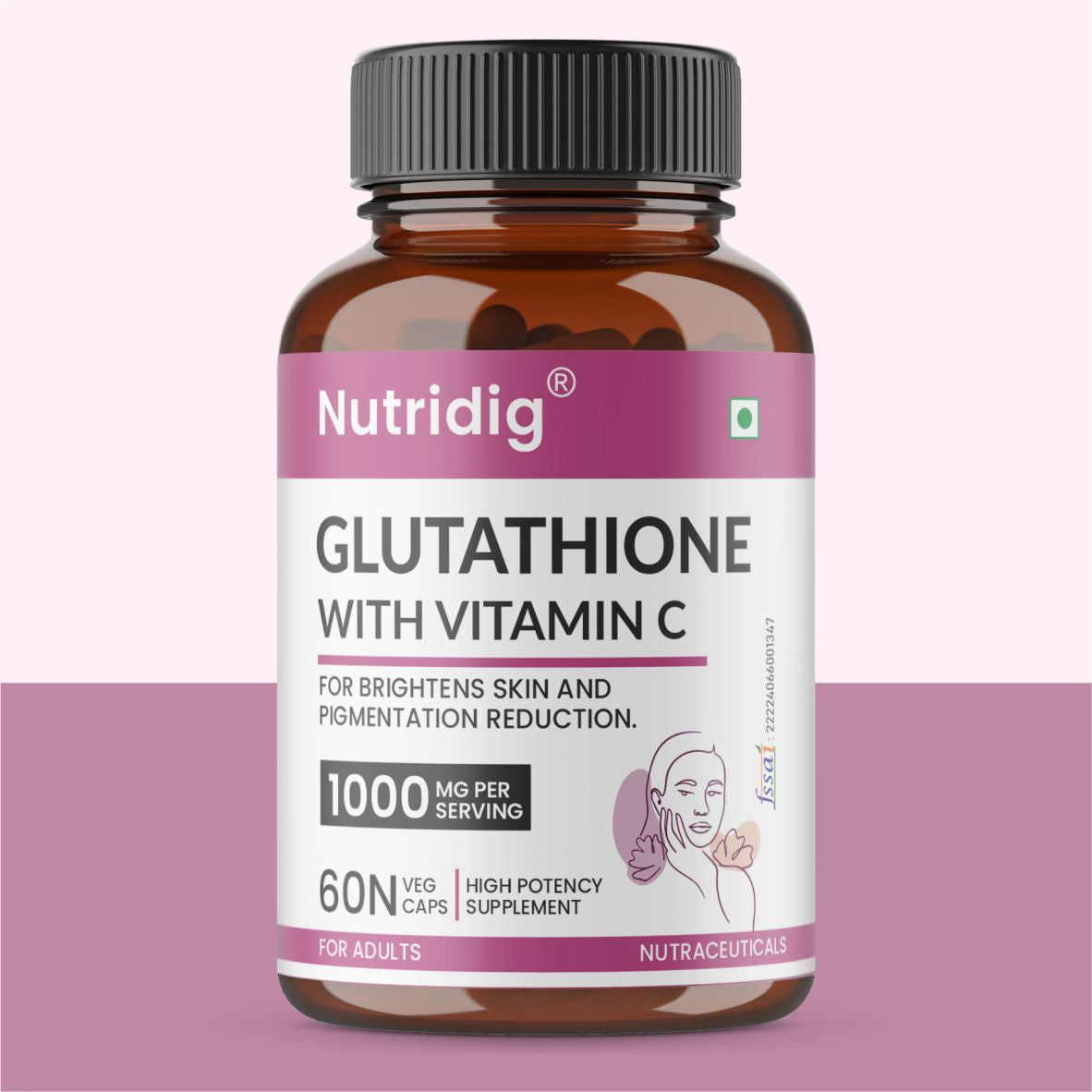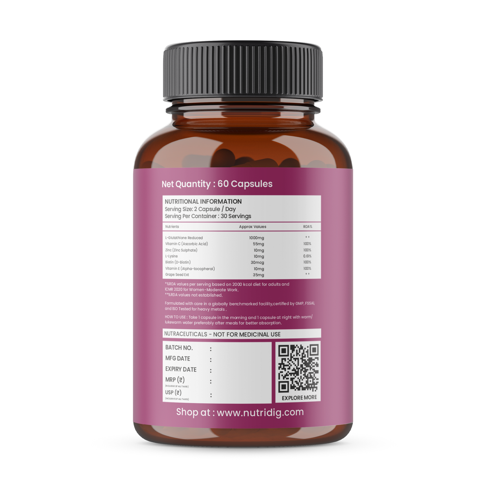 Nutridig® L-Glutathione Skin Brightening Capsules with Vitamin C, Zinc, Biotin | 60 Capsules