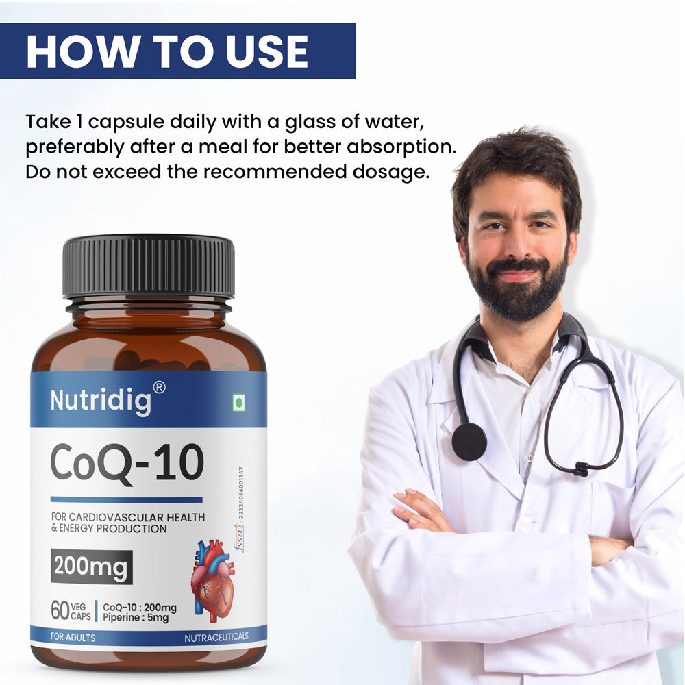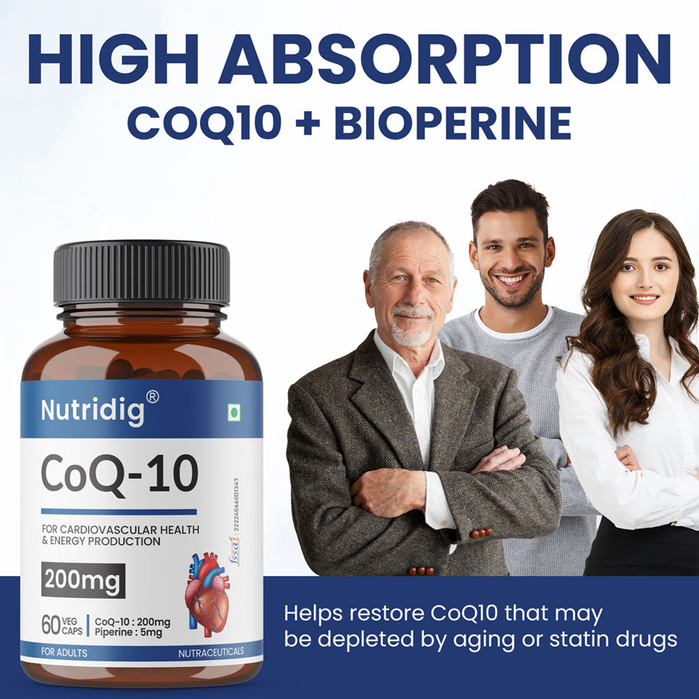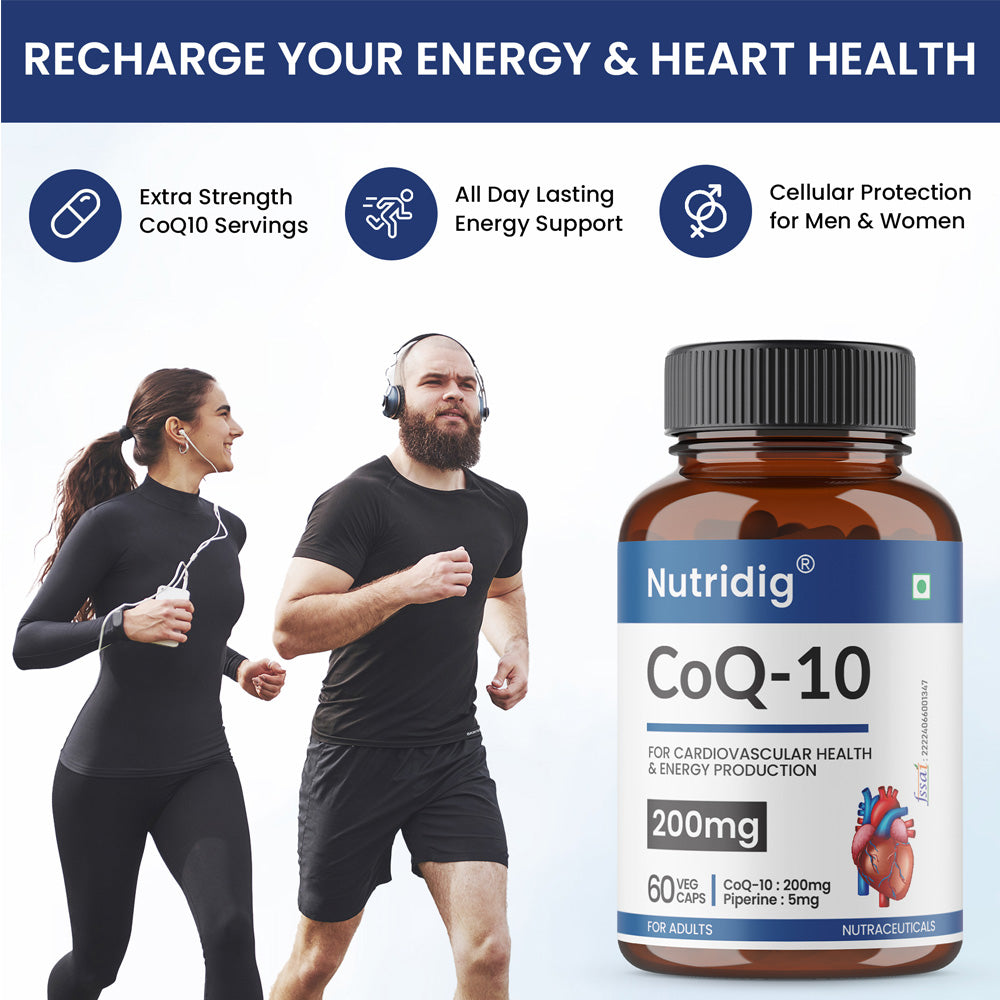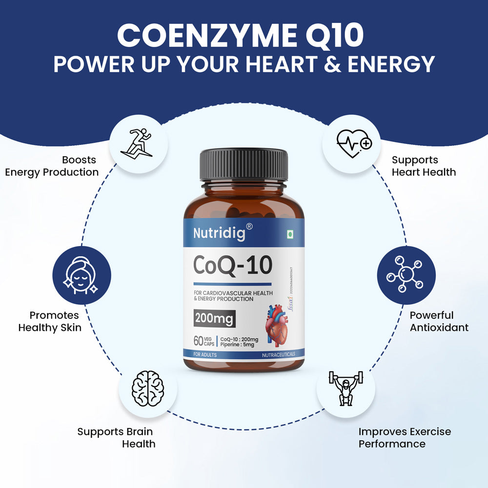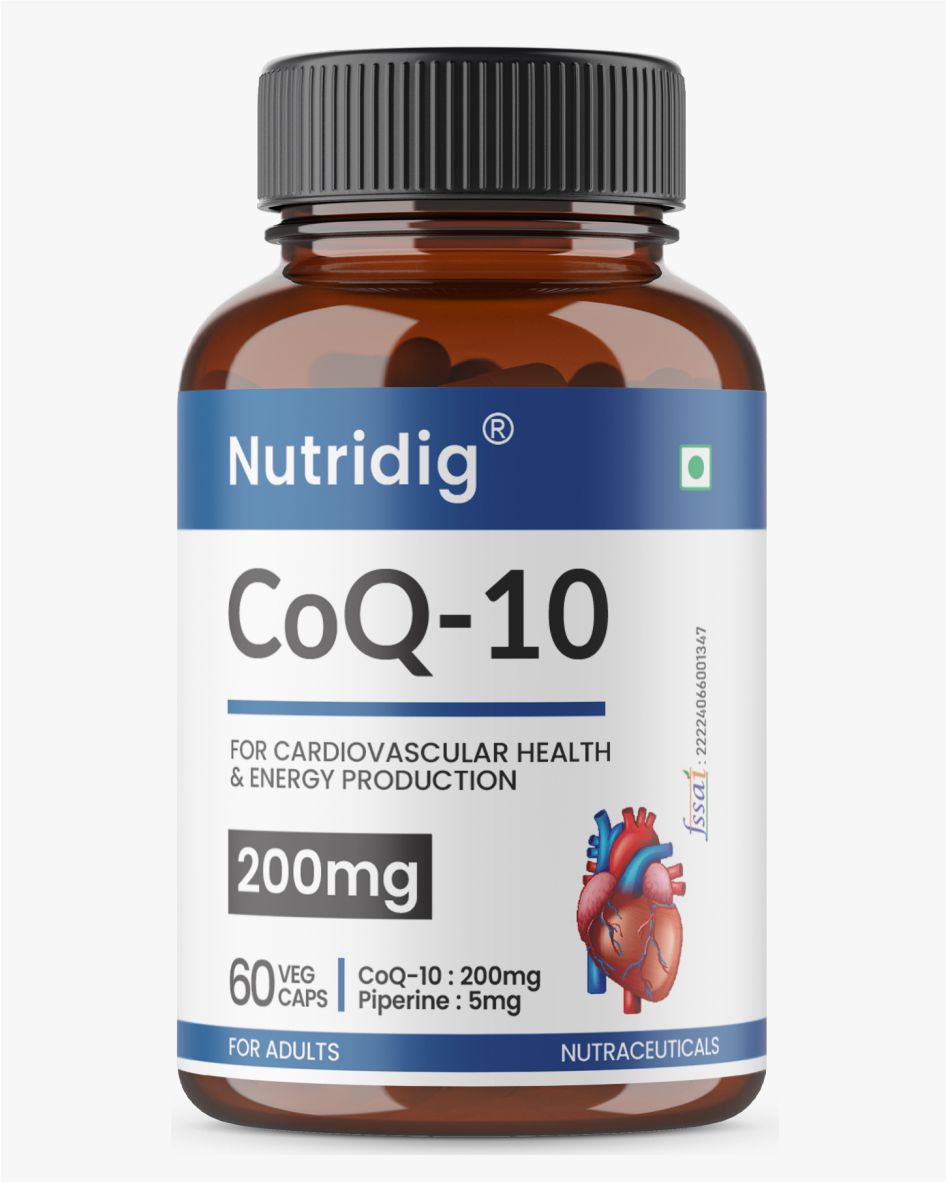 NutriDig CoQ10 with Piperine is a carefully formulated supplement that combines 200 mg of Coenzyme Q10 with black pepper extract (Piperine) to support daily energy, cellular health, and nutrient absorption—ideal for adults with active lifestyles.
