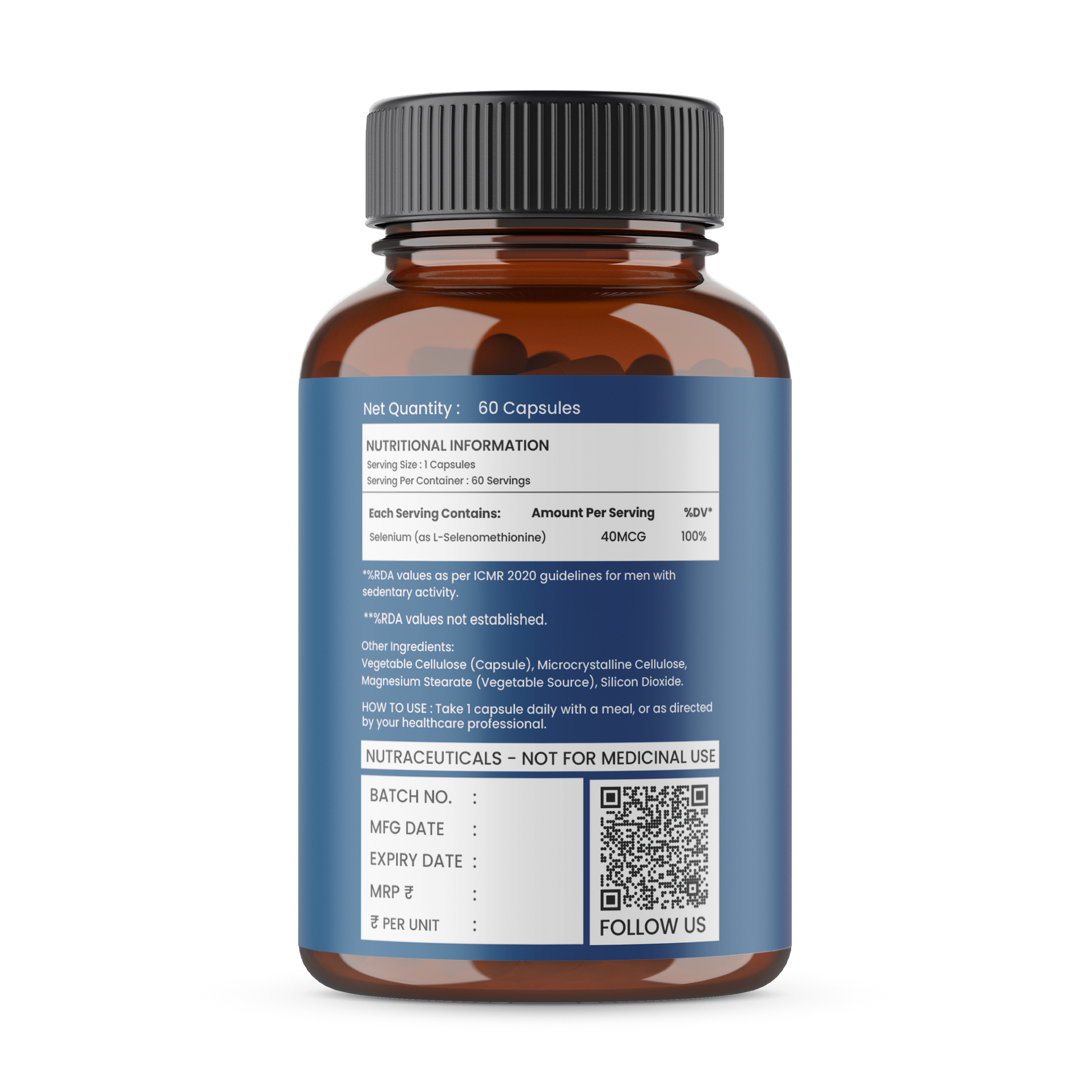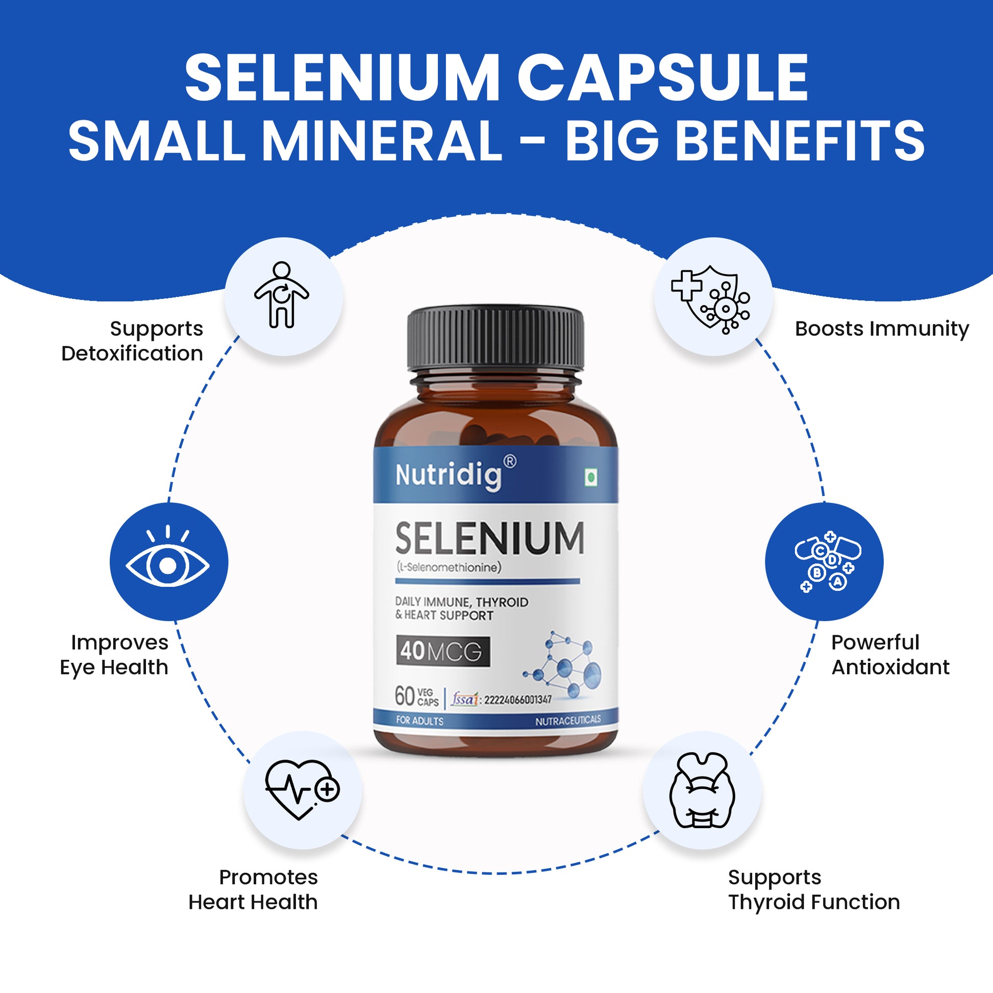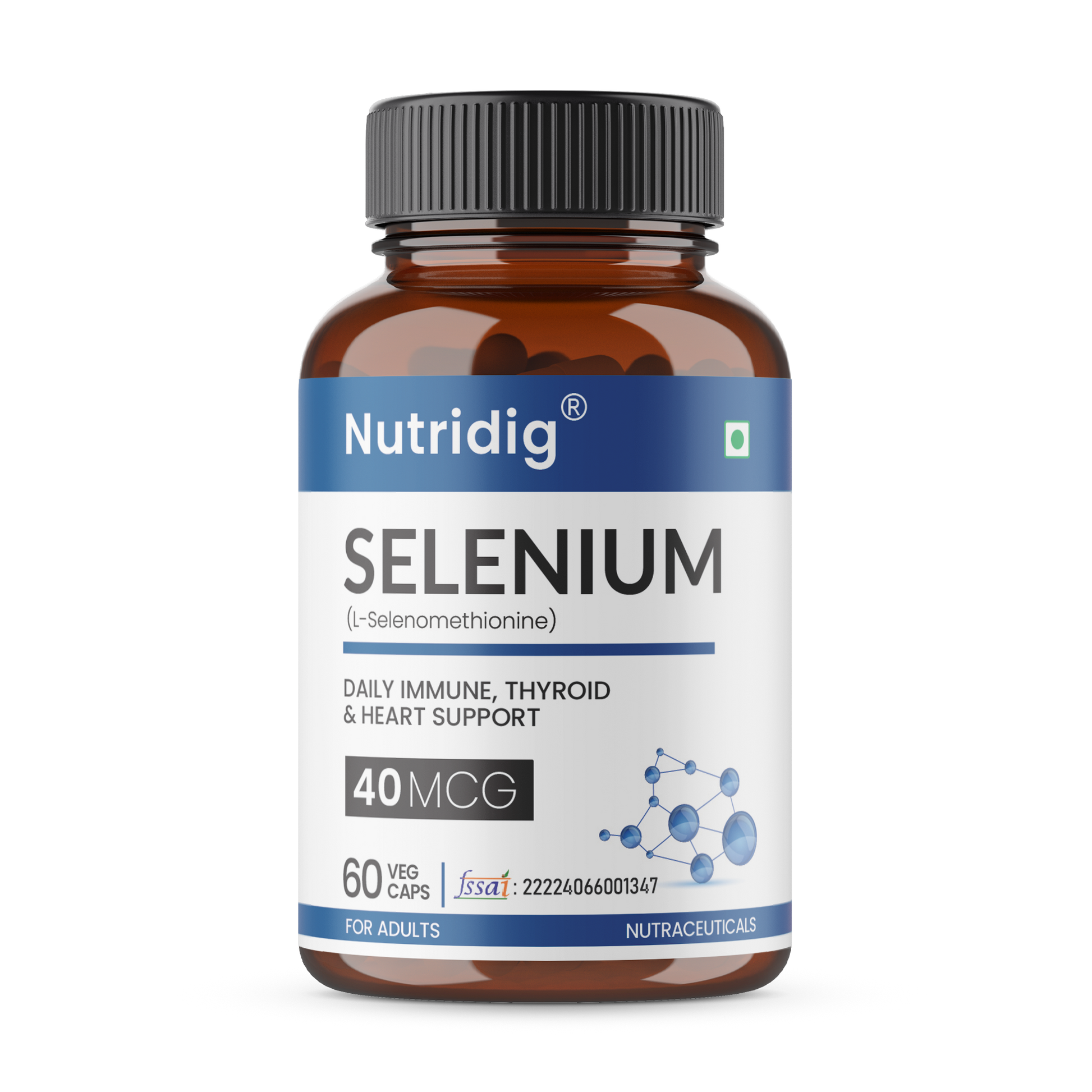 NUTRIDIG Selenium Capsules 40 mcg are expertly formulated to deliver a precise dose of this essential trace mineral to support overall wellness. Selenium plays a key role in antioxidant defense, immune system support, and healthy thyroid function.